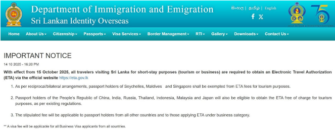 Представители ассоциации туроператоров России разъяснили нашим гражданам новые правила поездок в популярную среди туристов Республику. "15 октября 2025 года всем путешественникам, посещающим Шри-Ланку с кратковременной целью посещения, необходимо получить электронное разрешение на поездку (ETA) на официальном сайте https://eta.gov.lk". При этом визы по прилету больше не будут выдаваться. Соответствующая информация опубликована на сайте Департамента иммиграции и эмиграции Шри-Ланки.