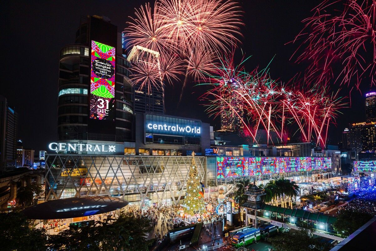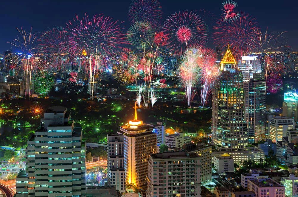 В Бангкоке Новый год проходит действительно масштабно. Город буквально пропитывается праздничной атмосферой веселья. Главное торжество устраивают на площади Central World Square. Ежегодно там проходит живой концерт, лазерное и фейерверк-щоу с панорамным обзором на 180 градусов. Праздничные мероприятия транслируются на огромных видеоэкранах, которые видны даже из удаленных локаций. После салюта шумная толпа из местных жителей и туристов спешно расходится по ресторанам и барам. Там веселье продолжается до утра.